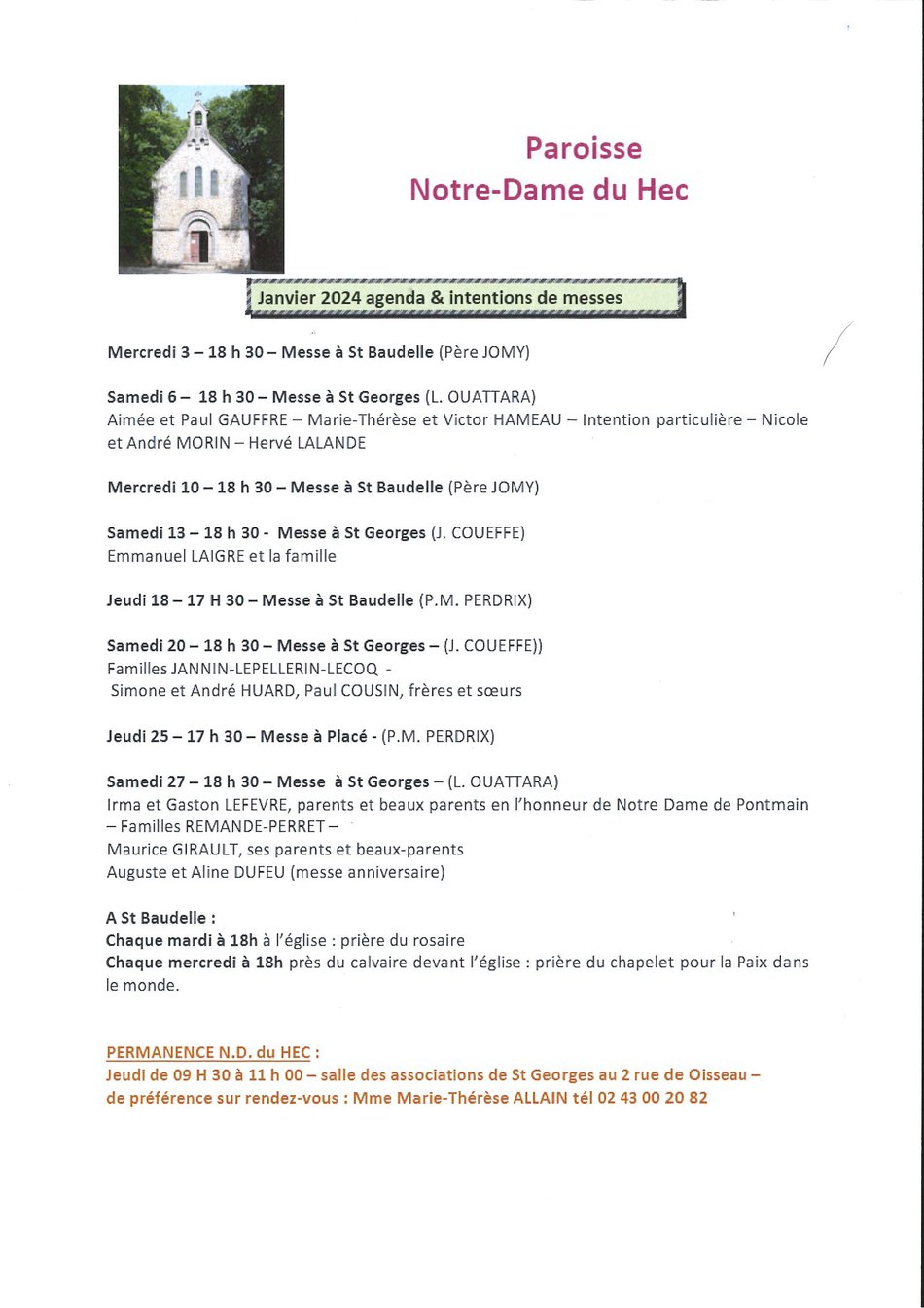 JANVIER 2024 - AGENDA et INTENTIONS DE MESSES