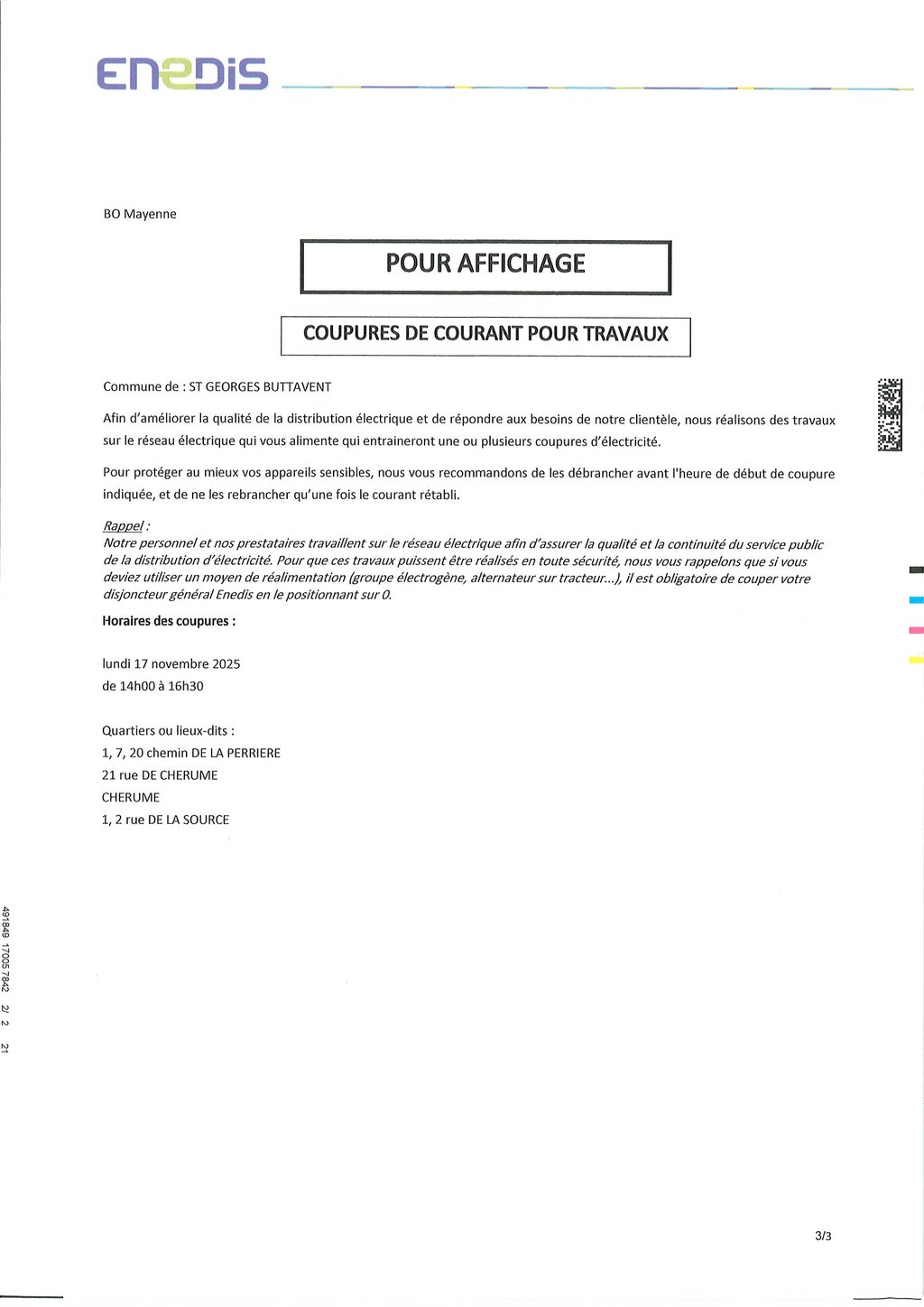 COUPURES DE COURANT POUR TRAVAUX ENEDIS 17/11/2025