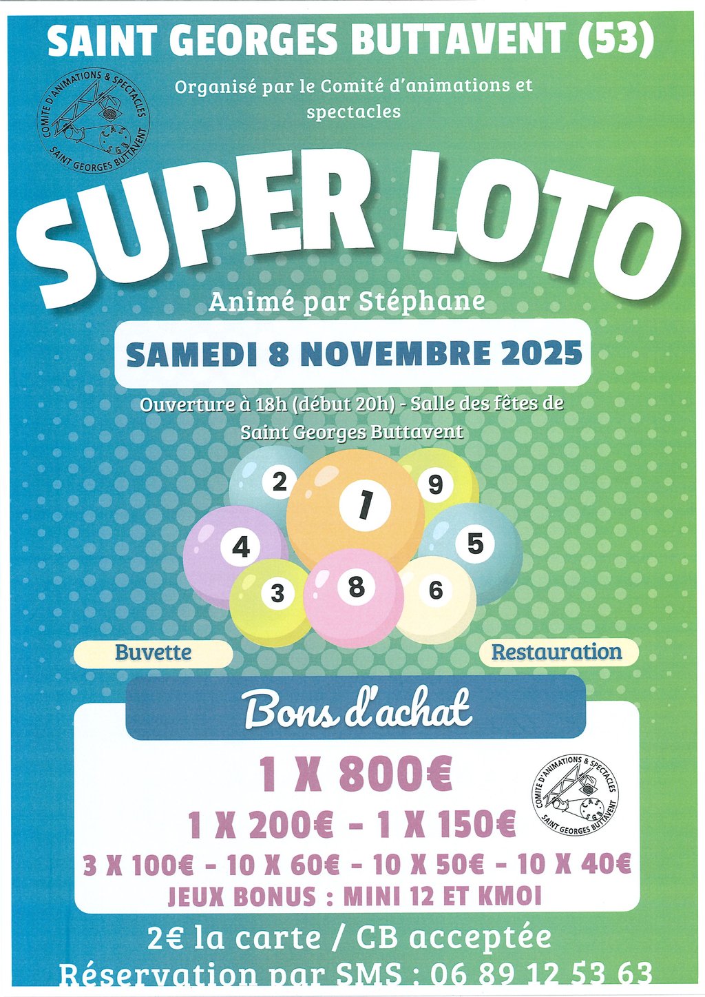 Venez nombreux au SUPER LOTO organisé par le Comité d'Animation et Spectacle de SAINT GEORGES BUTTAVENT qui se déroulera le 8 novembre 2025 à 20 Heures.
