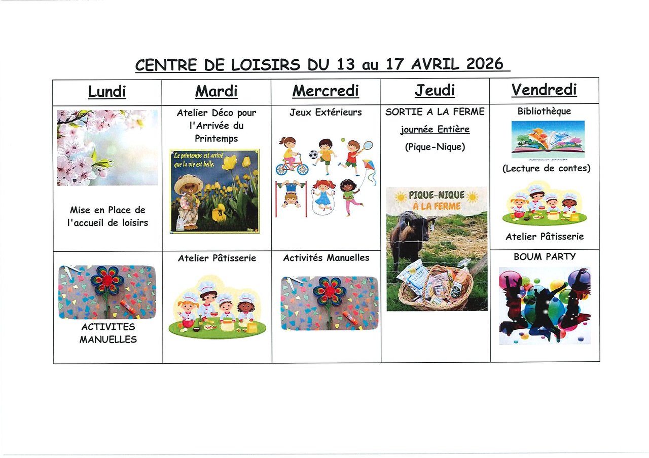 PLANNING DU 13 AU 17 AVRIL 2026 CENTRE DE LOISIRS VACANCES DE PRINTEMPS