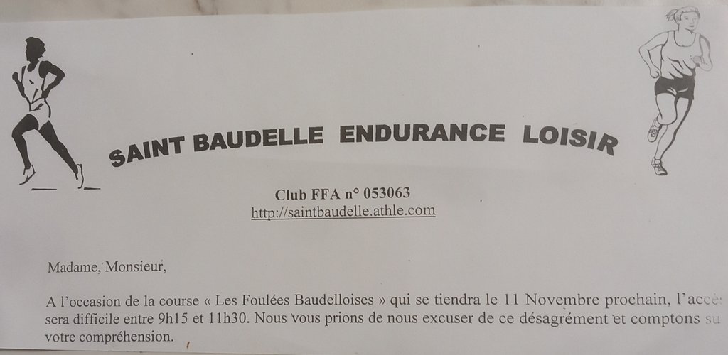 À l'occasion de la course les foules et baudeloise qui se tiendra le 11 novembre prochain, l'accès sera difficile entre 9h15 et 11h30. Nous vous prions de nous excuser de ce désagrément et comptons sur votre compréhension.