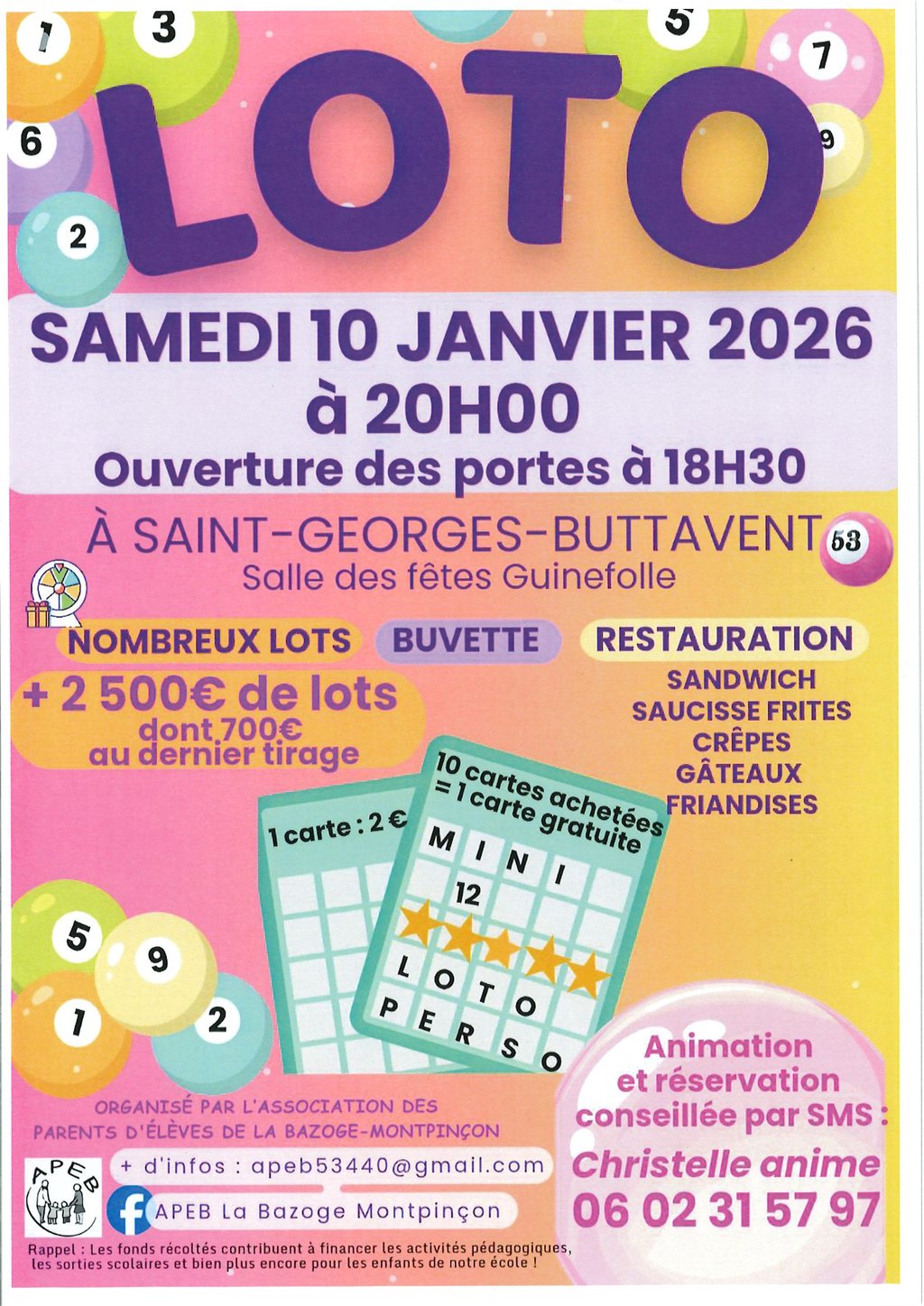 L'APE de LA BAZOGE MONTPINCON organise son loto le 10 janvier 2026 à partir de 18h30